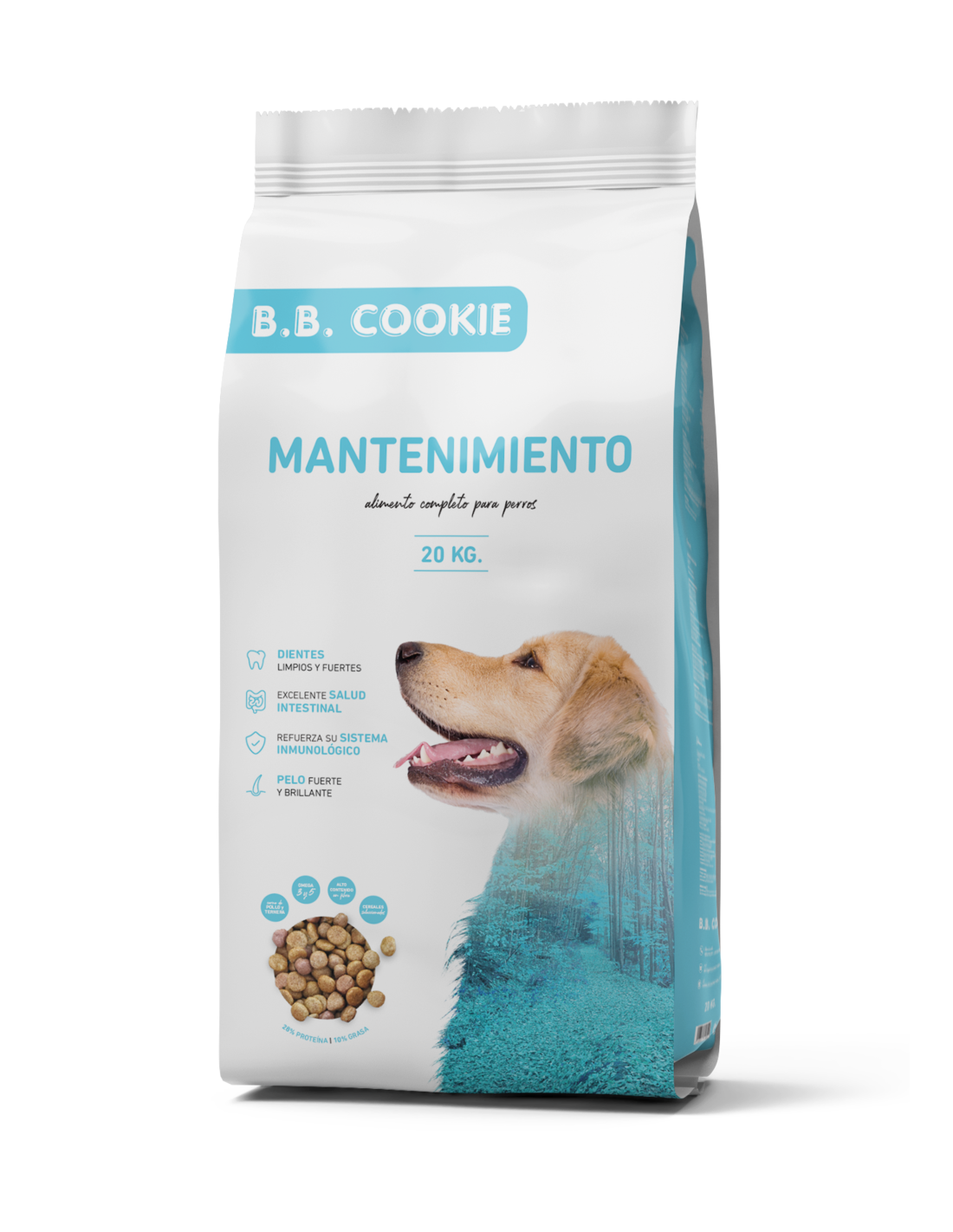 Protéines déshydratées de poulet et de veau, céréales sélectionnées (maïs, blé et orge), pâtes, produits de boulangerie, fibres végétales, huiles et graisses animales (saindoux de porc ibérique), minéraux et vitamines.